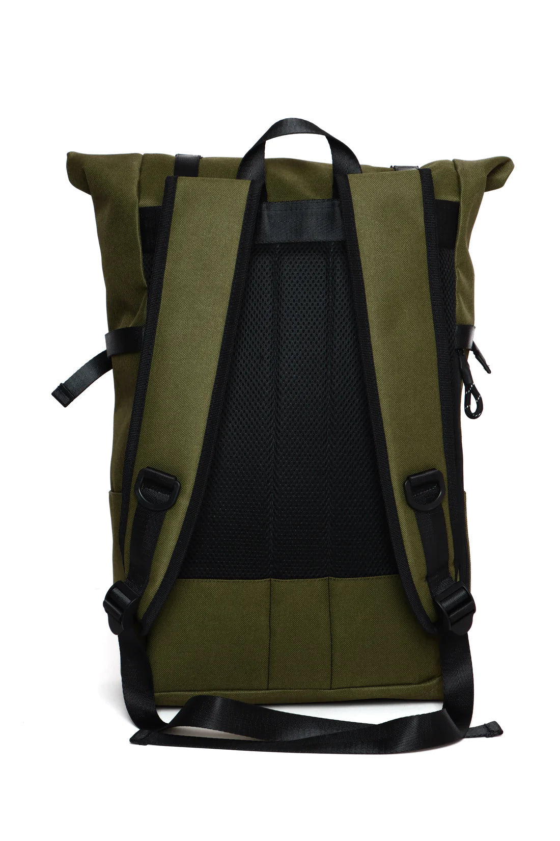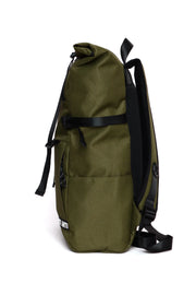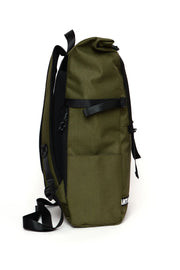 Mochila color verde, con doble forro para soportar lluvias ligeras, con broches exteriores para skate o accesorios y compartimento para laptop.